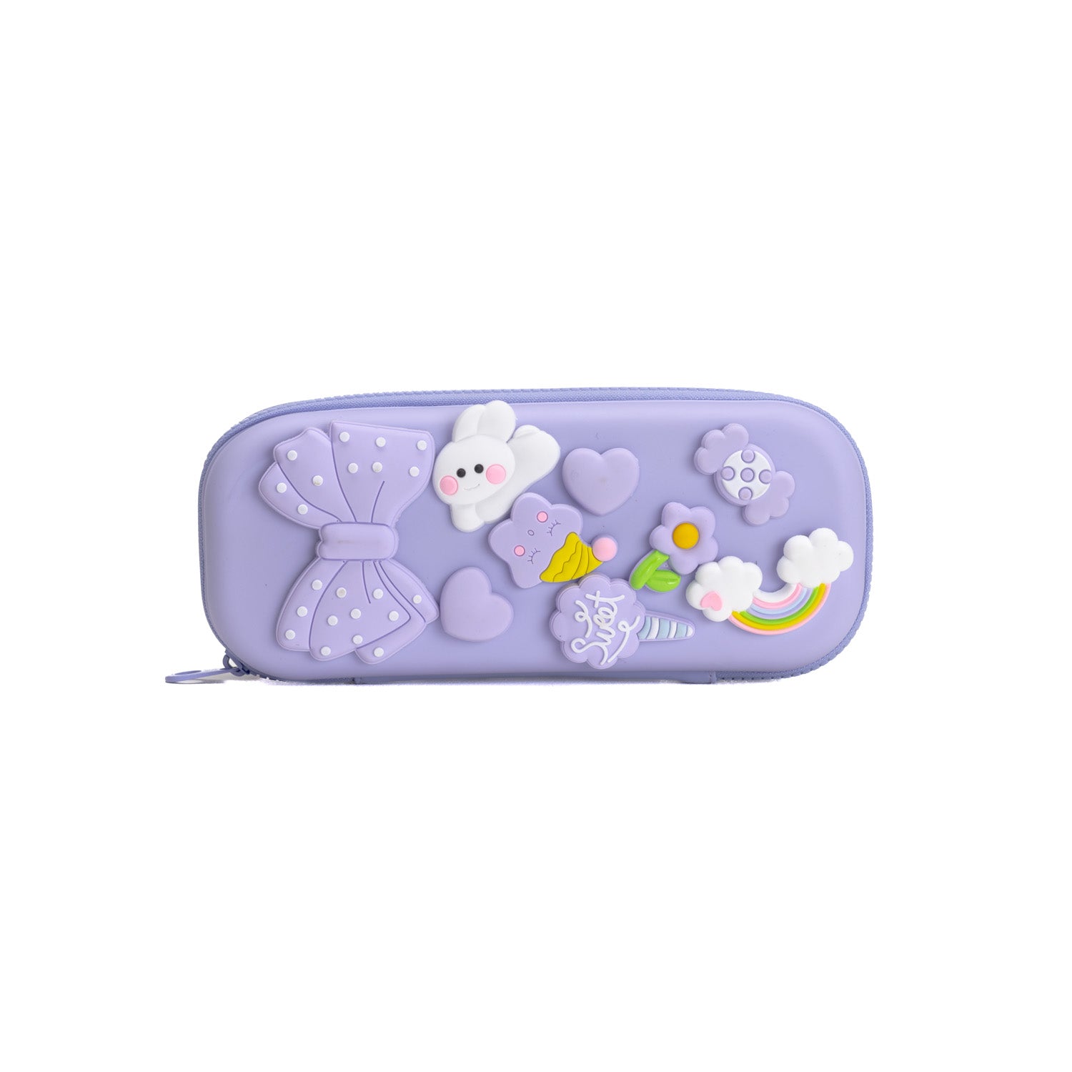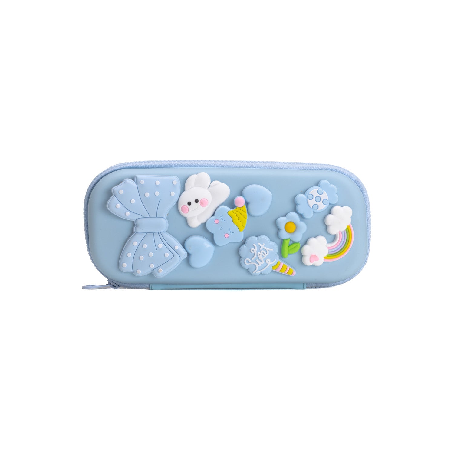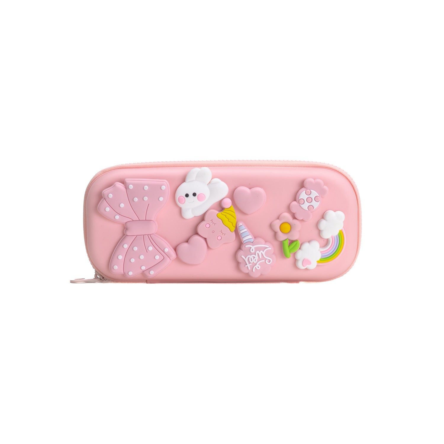 These adorable pencil cases feature charming pastel designs and fun 3D embellishments. Available in pink, light blue, and lavender, each case is decorated with cute bunnies, bows, hearts, and rainbows, making them perfect for storing stationery and adding a touch of whimsy to any desk or bag