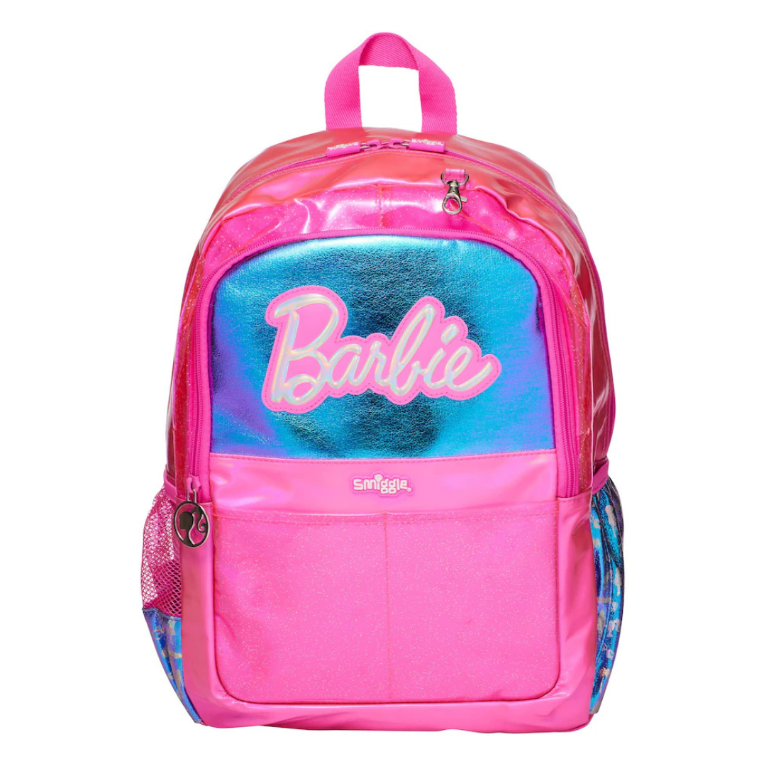 This Smiggle Barbie backpack is a vibrant pink with an iridescent Barbie logo. It features a spacious main compartment, a smaller front pocket, and side mesh pockets for water bottles. The iridescent pink and blue color-shifting material adds a touch of sparkle. Durable and stylish, it's perfect for school or everyday use.