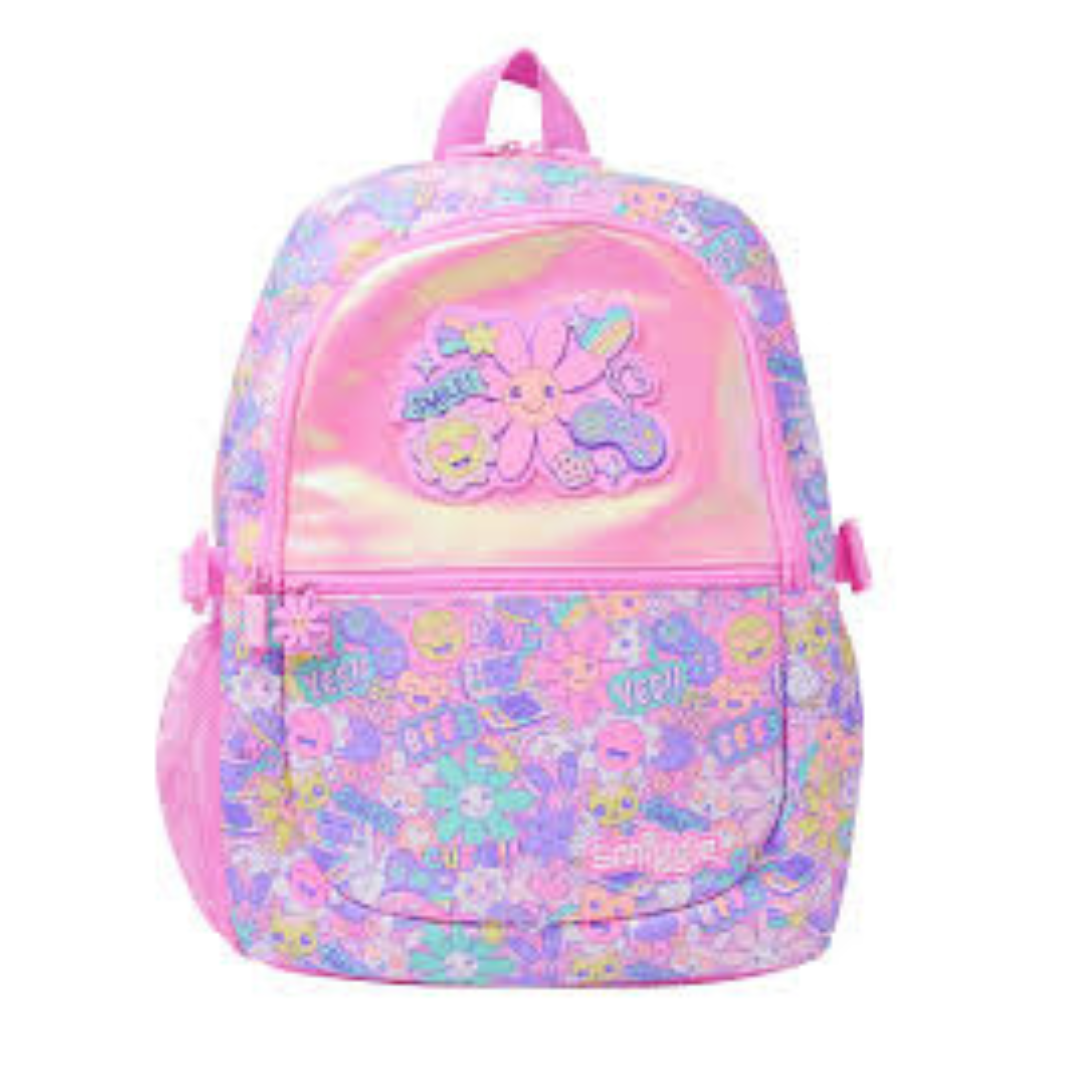 This Smiggle backpack is a burst of sunshine and positivity! The iridescent pink main compartment shimmers with a holographic effect, showcasing a cheerful design featuring smiling flowers, emojis, and playful phrases like "BFF" and "Yes!". The backpack features multiple compartments for organization, including a smaller zipped front pocket and a larger main compartment. Durable, adjustable straps ensure comfortable carrying. A charming flower patch adds a whimsical touch. This backpack is perfect for kids who love bright colors and fun, expressive designs, offering a blend of style and practicality.